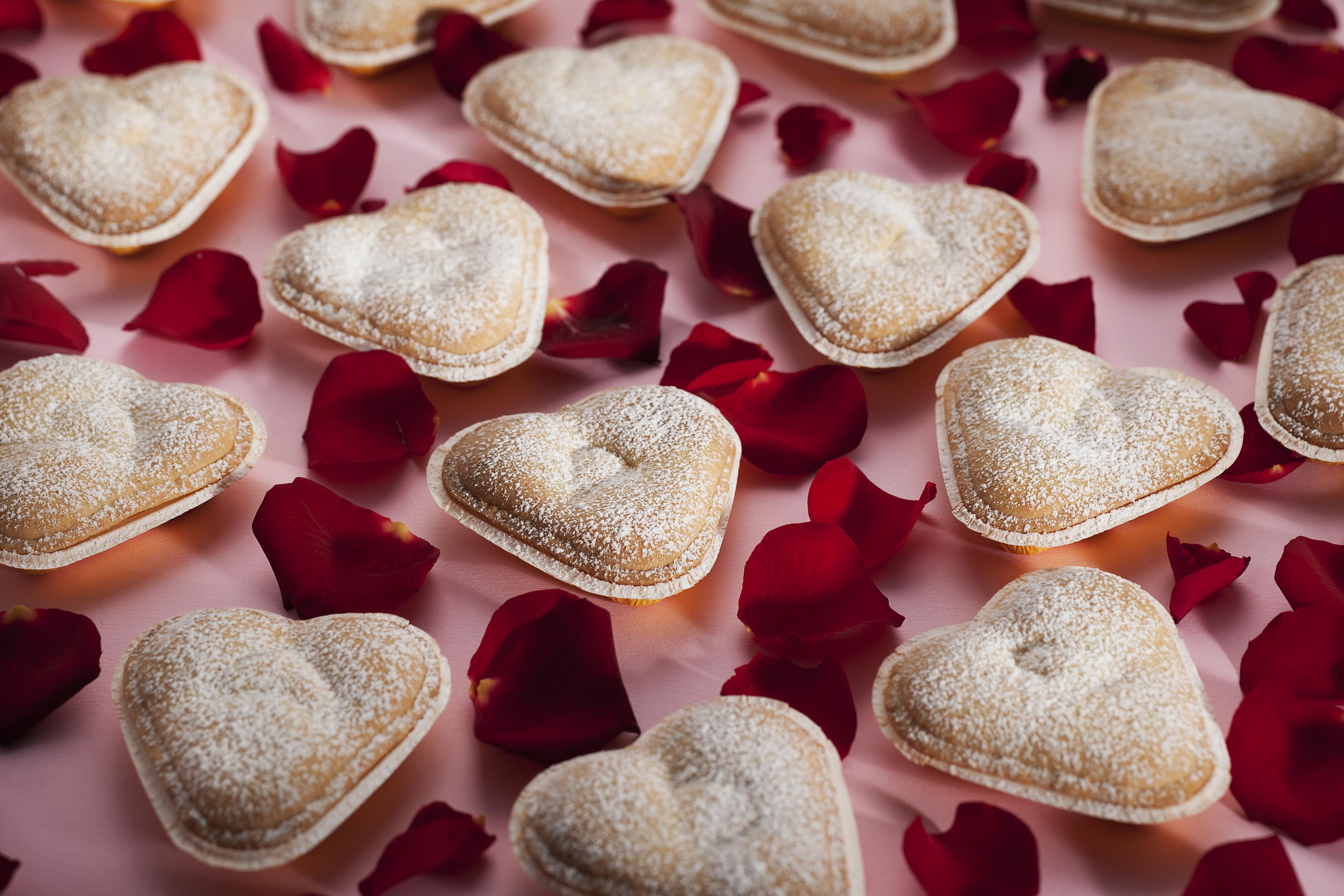 Färdigbakat mördegshjärta i pappform, fyllt med vaniljkräm.