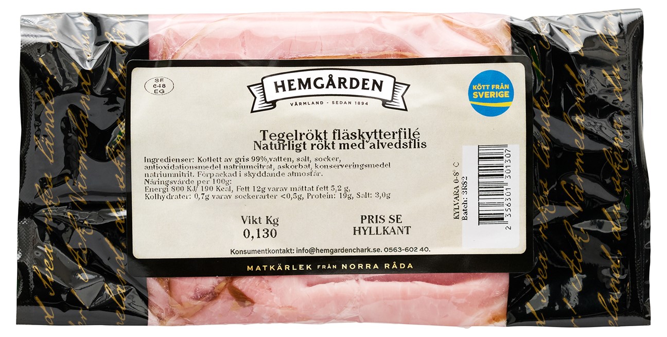 Ingredienser: Kotlett av gris, vatten, salt, socker, stabiliseringsmedel natriumfosfat, antioxidationsmedel natriumcitrat, askorbat, konserveringsmedel natriumnitrit. Till 100 g färdig vara har 105 g kött från gris använts. Förpackad i skyddande atmosfär.