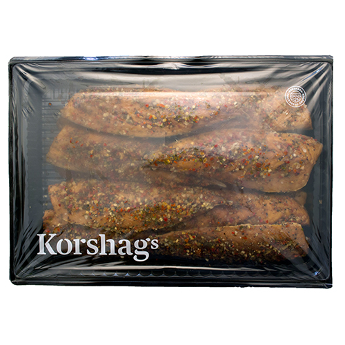 Vildfångad makrill av premiumkvalitet i stora fina filéer. Färskrökt för hand i Falkenberg enligt traditionellt recept med enbär, färskflisad alved från Halland och helt utan tillsatser. De naturliga aromerna från veden ger en välbalanserad röksmak och fin karaktär. Kryddad med jägarkyrdda som är en paprikamix.