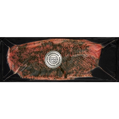 Gravad lax av högsta kvalité (superior, D-trim) i fina skivor. Färskgravad för hand i Falkenberg enligt vårt originalrecept med salt, socker, dill och vitpeppar och helt utan tillsatser. Hållbart odlad (ASC) och nyckelhålsmärkt. Utmärkt till buffé, smörrebröd och smörgåstårtor.