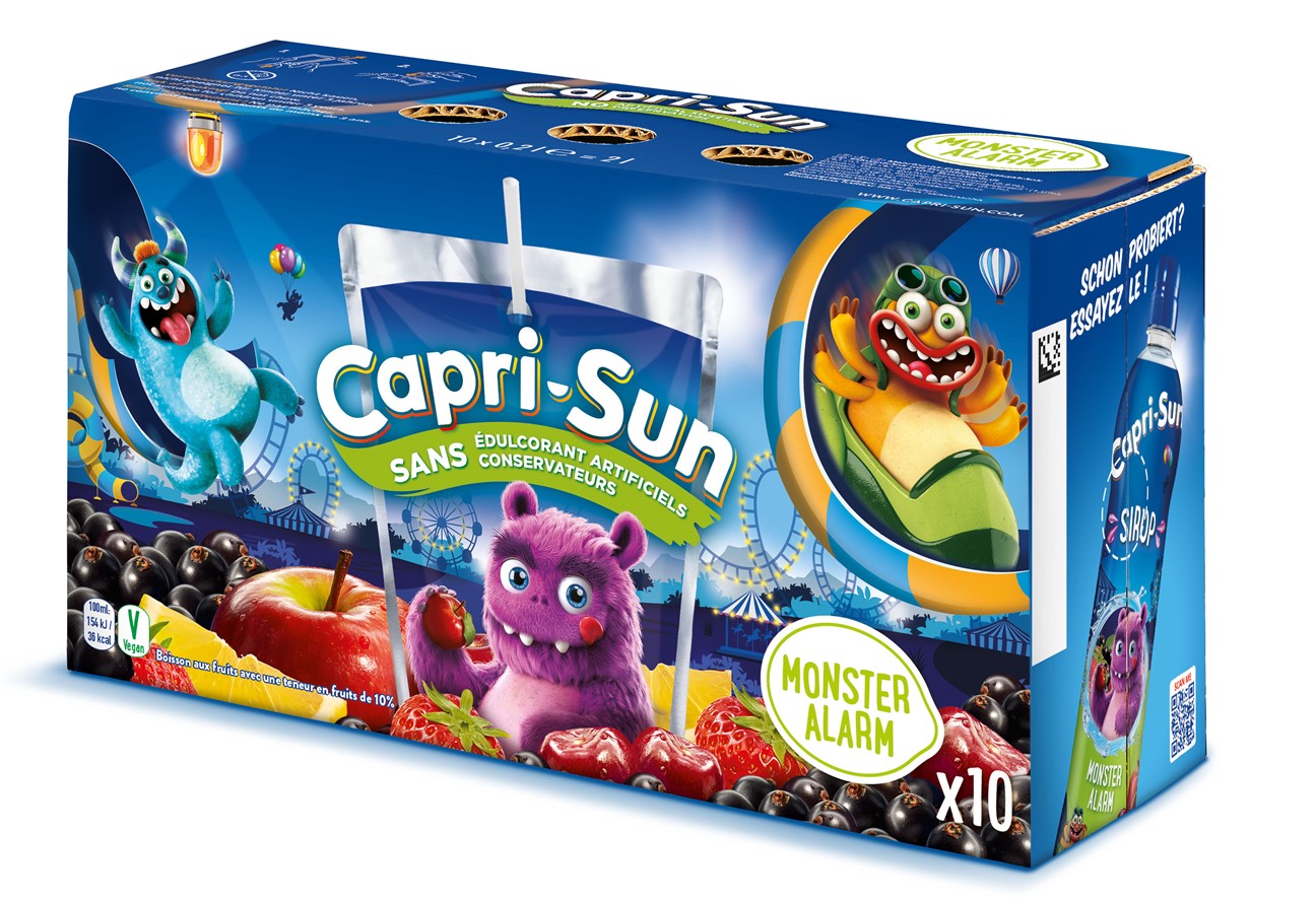 Marknadsbudskap Marknadsbudskap: Capri-Sun Monster Alarm fruktig mix med smak av äpplen, svarta vinbär och syrliga körsbär.