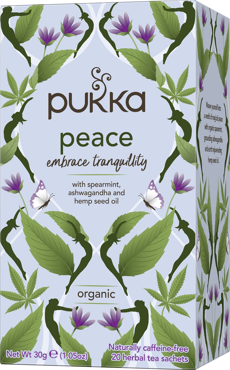 Pukka Peace är ett örtte med en blandning av grönmynta, ashwagandha, hampafröolja, lavendel, kamomill och lakrits. Pukka Peace är naturligt koffeinfritt. 100% etiskt odlade och ekologiska ingredienser och Fair for Life certifierade.