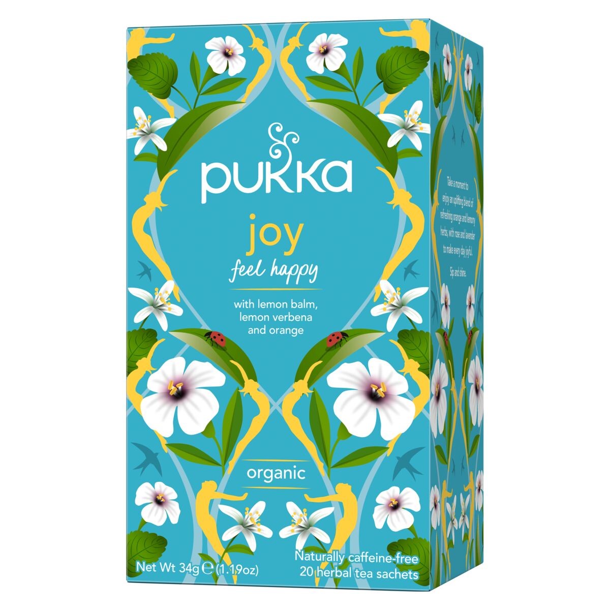 Marknadsbudskap Pukka Joy är ett upplyftande örtte som innehåller en blandning av tio olika frukter och örter, bland annat citronmeliss, bergamott, apelsin, lavendel och ros. En blandning med friska toner av citrus som hjälper till att lugna sinnet och ge glädje i vardagen. Pukka Joy är - precis som alla Pukkas teer tillverkat av ekologiska ingredienser och är fritt från artificiella smakämnen. Naturligt koffeinfritt och självklart både ekologisk och Fair For Life certifierad.