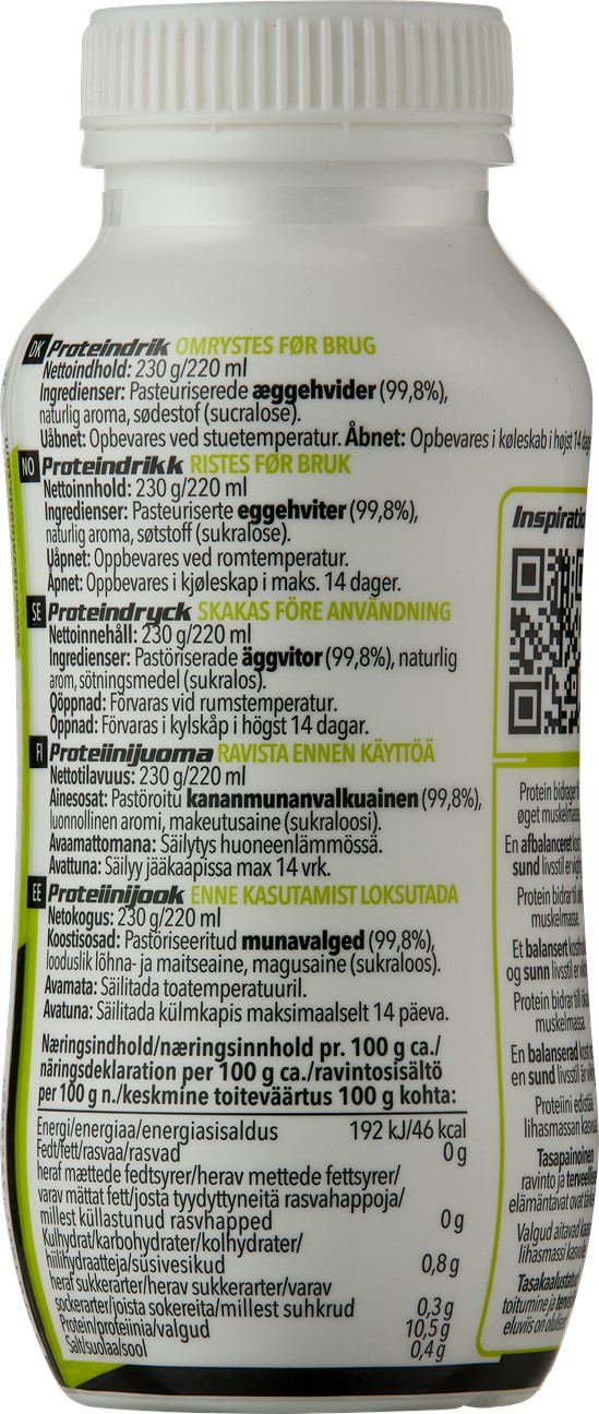 Ingredienser Pastöriserade ÄGGVITOR (99,8%),naturlig arom, Sötningsmedel (Sukralos)