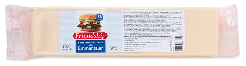 Beskrivning Artikelkategori: Hamburgerost skivor med Emmentaler Varumärke: Friendship Förpackningsstorlek: 1250g