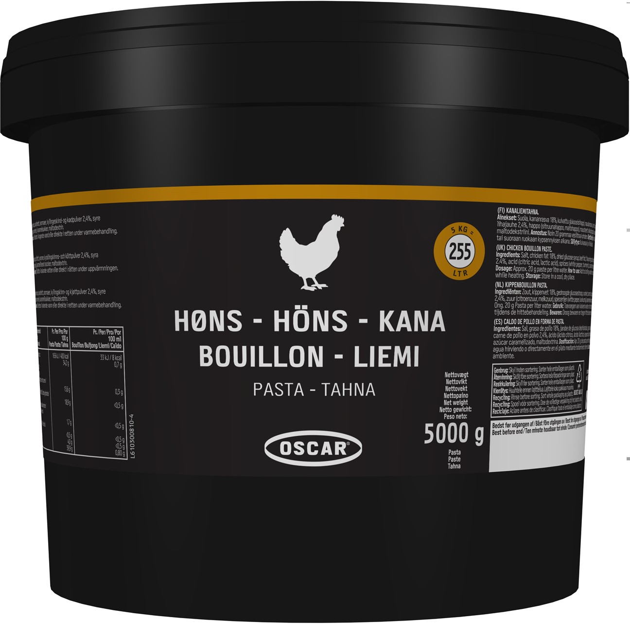 OSCAR Hönsbuljong pasta är en kraftfull och smakrik buljong. Buljongen har smaken av kycklingskinn, som ger en bra bas i t.ex. kokta rätter som currykyckling och i en pajfyllning. Om du vill ha en mer stekt smak kan du komplettera buljongen med OSCAR Stekt Smak, så får du en bra bas till en god skysås.