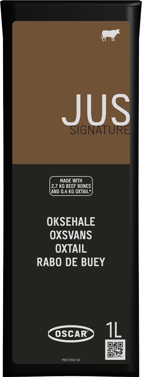 | Marknadsbudskap: | OSCAR Signatur Oxsvans Jus har en ren intensiv smak, där vi endast har tillsatt lök och lökskal. Det gör vi för att inte dölja den rena köttsmaken. Oxsvans Jus är en bra bas att börja med och sedan kan du sätta din egen signatur. Det är en klar oxsvans jus, som kan användas som sky och i såser. Tack vare innehållet av oxsvansar har du ett naturligt innehåll av kollagen som gör att du enkelt kan reducera den till en glace. 1 liter OSCAR Signature Oxsvans Jus kokas på 2,7 kg nötben och 0,4 kg oxsvansar. |