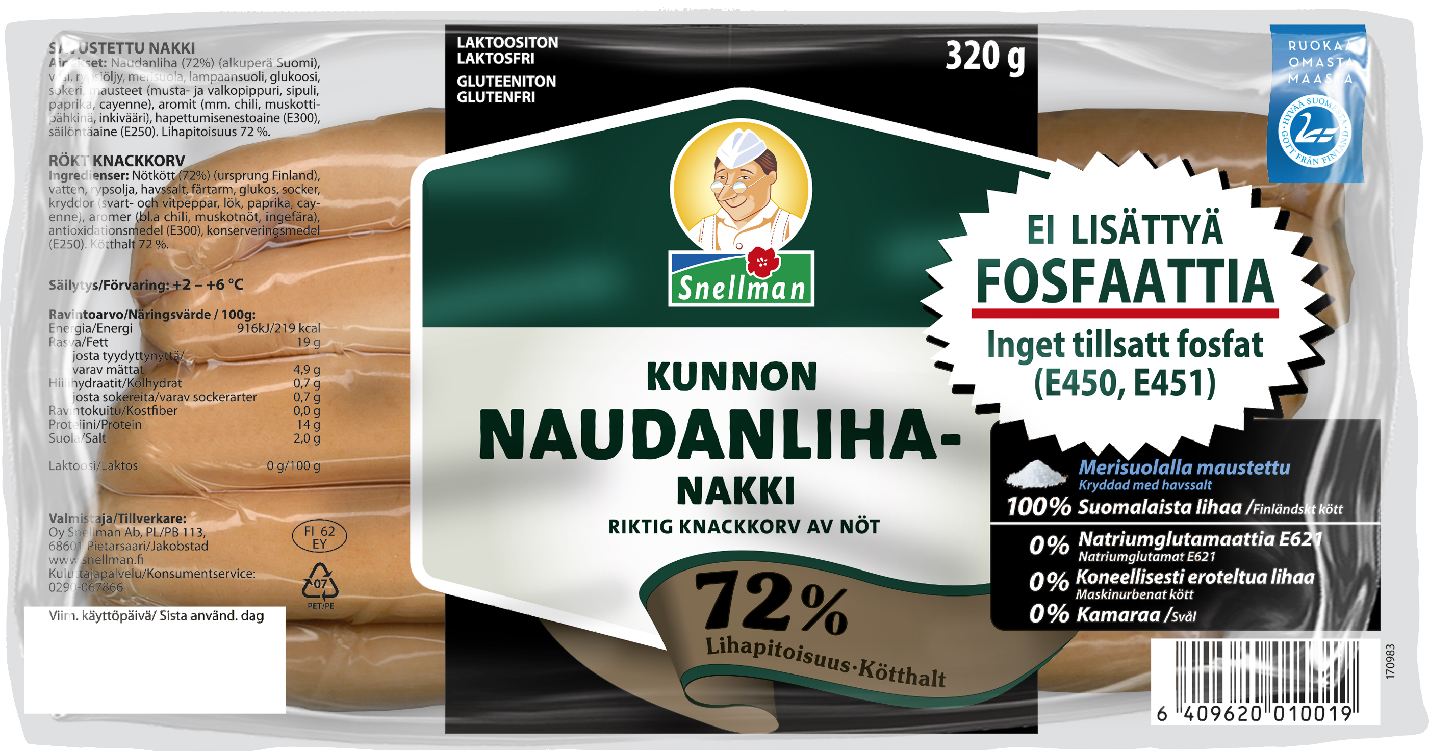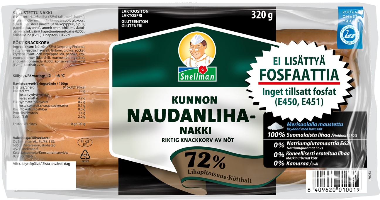Riktig knackkorv av nöt 320g. 72% kötthalt Vid tillverkningen används fårtarm, så produkten passar även konsumenter som inte äter griskött.