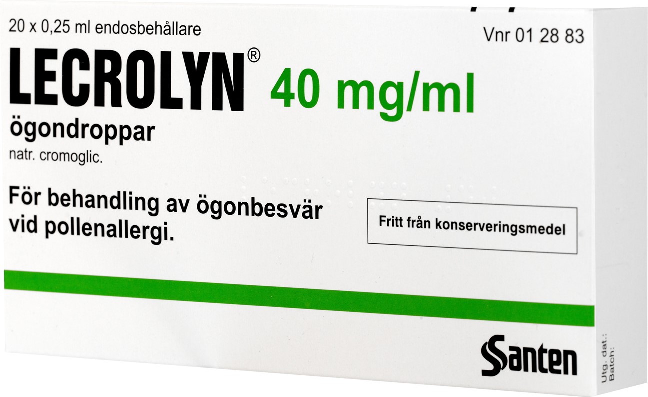 | Användningsinstruktioner | Lecrolyn ögondroppar används vid behandling av allergiska ögonbesvär såsom pollenallergi med t.ex. rodnad, klåda och ökat tårflöde. Rekommenderad dos är: Lecrolyn 40 mg/ml: 1–2 droppar i vardera ögat 2 gånger om dagen för vuxna och barn. Behandlingen inleds vid de första symtomen och pågår under hela pollensäsongen. Kontakta läkare om inte förbättring skett inom några dagar. En endosbehållare innehåller tillräckligt med lösning för behandling av båda ögonen. Kasta bort den använda endosbehållaren. Lecrolyn ögondroppar i endosbehållare innehåller inte konserveringsmedel varför de kan användas tillsammans med mjuka kontaktlinser. Information om hur man ska droppa finns i bipacksedeln. |