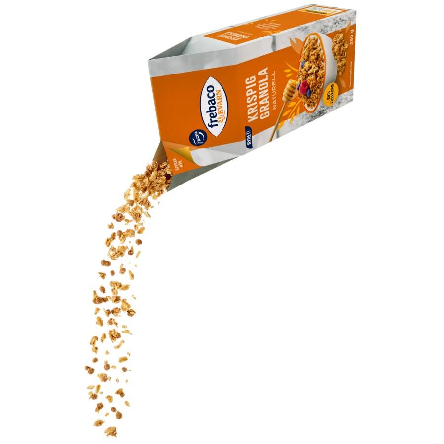 Frebaco Kvarn Krispig granola Naturell har en lättare och krispigare textur tack vare en granolablandning av fullkornhavreflingor samt krispiga puffar. Med en hint av honung och gudomlig smak!