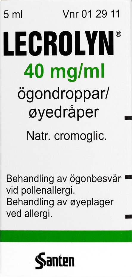 Användningsinstruktioner | Lecrolyn ögondroppar används vid behandling av allergiska ögonbesvär såsom pollenallergi med t.ex. rodnad, klåda och ökat tårflöde. Rekommenderad dos är: Lecrolyn 40 mg/ml: 1–2 droppar i vardera ögat 2 gånger om dagen för vuxna och barn. Behandlingen inleds vid de första symtomen och pågår under hela pollensäsongen. Kontakta läkare om inte förbättring skett inom några dagar. Lecrolyn innehåller bensalkoniumklorid. Kan ge ögonirritation. Undvik kontakt med mjuka kontaktlinser. Avlägsna kontaktlinser före applikation och vänta minst 15 minuter innan de sätts in igen. Kan missfärga mjuka kontaktlinser. Information om hur man ska droppa finns i bipacksedeln. |