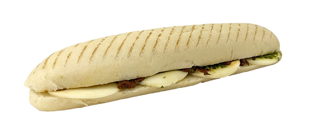 Paninibröd med vackra grillränder, fyllt med soltorkade tomater, krämig mozzarella och fräsch basilikapesto. Tina och servera – lättare blir det inte. Snabb och enkel servering. Perfekt för lunch, café eller take away.