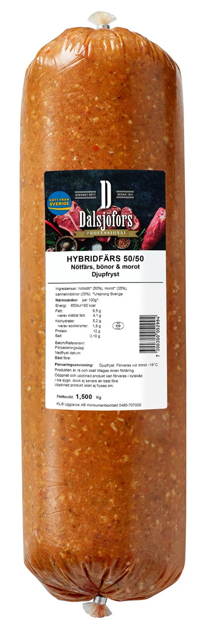 Ett bra alternativ när du vill välja nöt- och växtbaserad färs. Färsen är gjord av 50% nötfärs från svenska gårdar, 25% svensk morot och resterande 25% Cannelinibönor. Den är packad i rullpack och fryst.