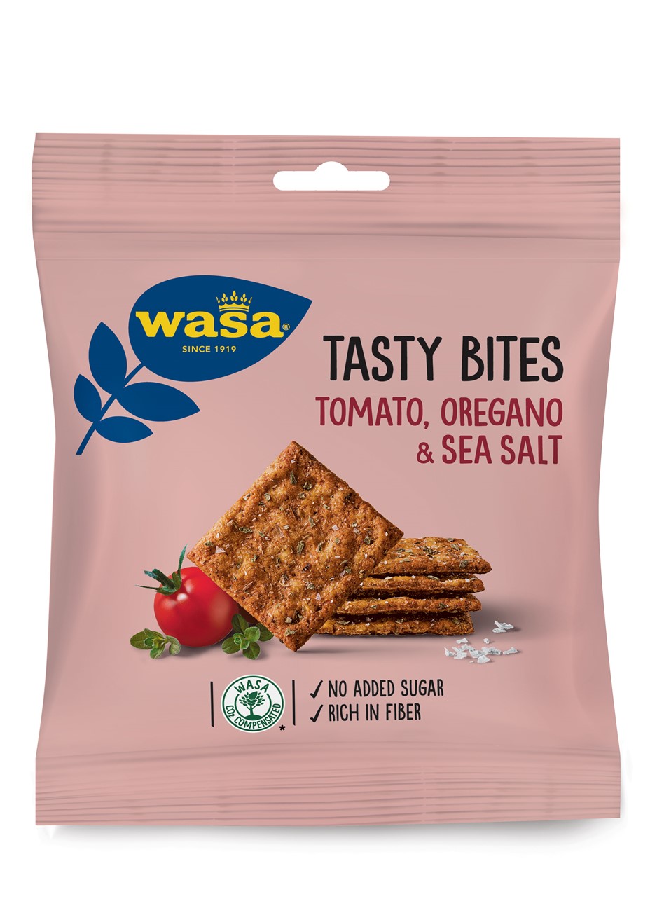Tasty Bites Tomat & Oregano är små, goda knäckesnacks från Wasa. Ett rågknäcke gjort på endast några få utvalda ingredienser men trots detta är dessa rågchips fulla av smak och krispighet. Dessa små knäckebitar är rågbaserade och innehåller mer än 15% fiber. Dessutom är de gjorda helt utan tillsatt socker och har en återvinningsbar förpackning. Tasty Bites är perfeka små knäckesnittar att äta som mellanmål både när du är på språng men även som snack under arbetsdagen. Självklart är Tasty Bites rågknäckebröd precis som Wasas övriga knäckebröd 100% klimatkompenserade.