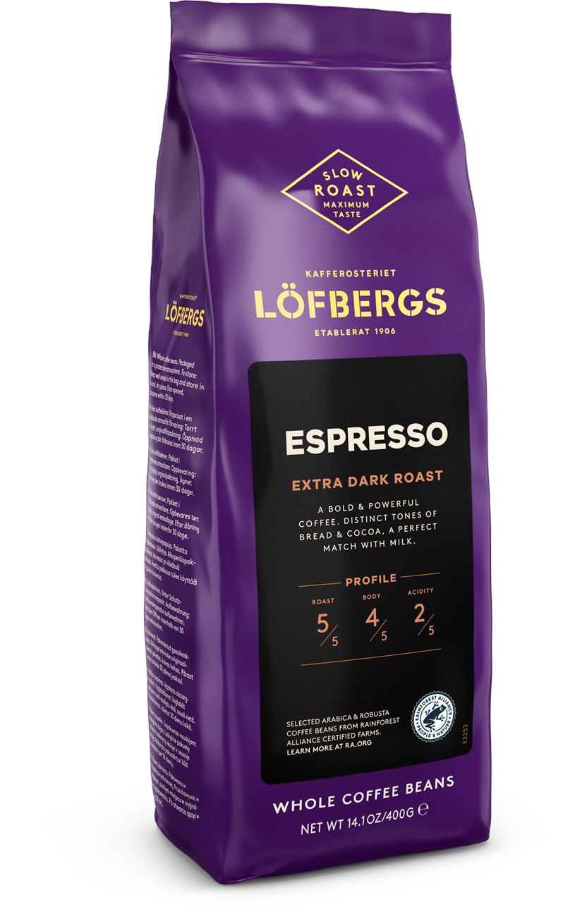 Löfbergs Espresso är ett kraftigt och fylligt espressokaffe med distinkta toner av bröd och choklad. Noga utvalda premiumbönor från Syd- och Centralamerika samt Östafrika. Bönorna är varsamt rostade enligt Slow roast metoden för att maximera kaffebönornas arom och smak. Kaffet är certifierat av Rainforest Alliance, vilket är en oberoende organisation som arbetar för att skapa hållbara försörjningsmöjligheter för kaffeodlare och att bevara den biologiska mångfalden. HÅLLBARHET PÅ KAFFET: Kaffebönorna bör förvaras torrt och svalt i väl tillsluten originalförpackning, då bevaras aromerna som bäst. Öppnad förpackning bör förbrukas inom 30 dagar. Löfbergs hela kaffebönor är förpackade i en skyddande atmosfär. NÄR KAFFET ÄR SLUT: Källsortera förpackningen som plast. Kaffesump sorteras som matavfall och kan komposteras.