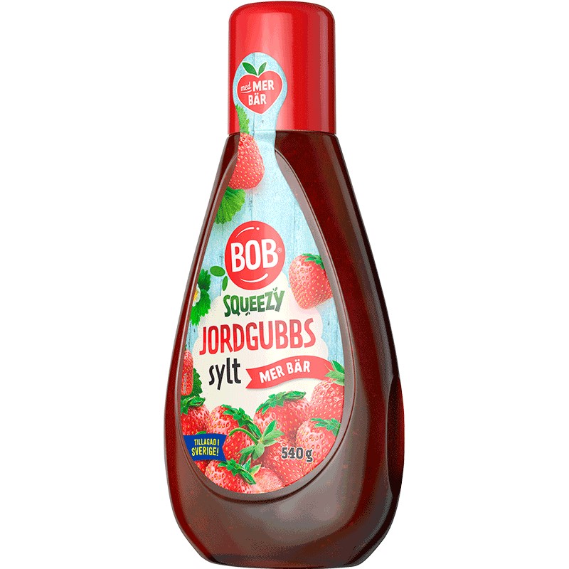 | Marknadsbudskap: | BOB Jordgubbsylt i smart klämflaska. BOB sylt är av hög kvalitet, gjord på utvalda bär. Den släta sylten är perfekt för frukosten, mellanmålet eller till pannkakor och våfflor. Den är dessutom smidig att få med på picknicken! BOB sylt kokas i skånska Tollarp. Hel frukt mals sönder på plats i fabriken och kokas därefter till en slät konsistens som passar perfekt i klämflaskan. Besök BOB.se för mer inspiration och massor av recept. |