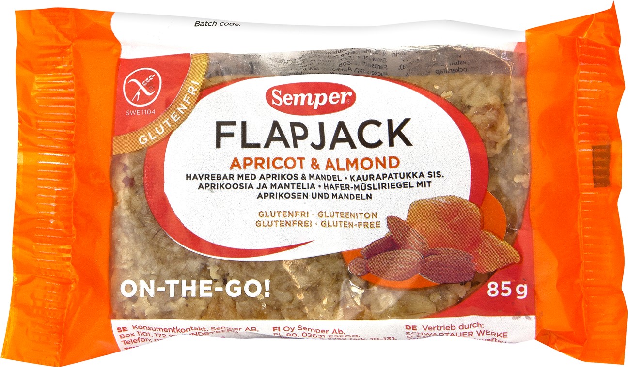 FLAPJACK MELLANMÅL SNACK MANDEL APRIKOS GLUTENFRI LAKTOSFRI SEMPER