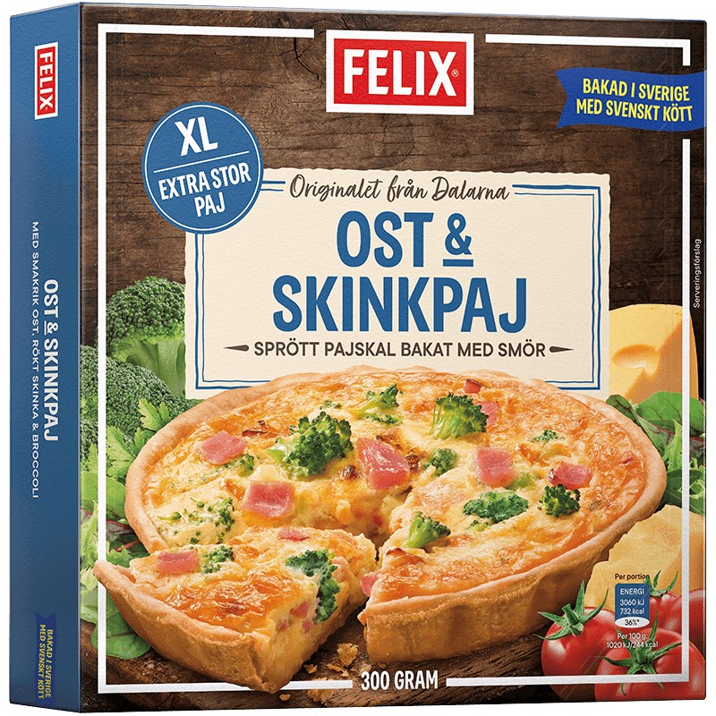 Felix XL Ost & skinkpaj är en extra stor och matig paj med krämig fyllning gjord på smakrik ost, svensk rökt skinka, broccoli, färsk mjölk och grädde samt svenska ägg från frigående höns. Pajskalet är sprött och bakat med smör för den goda smakens skull!