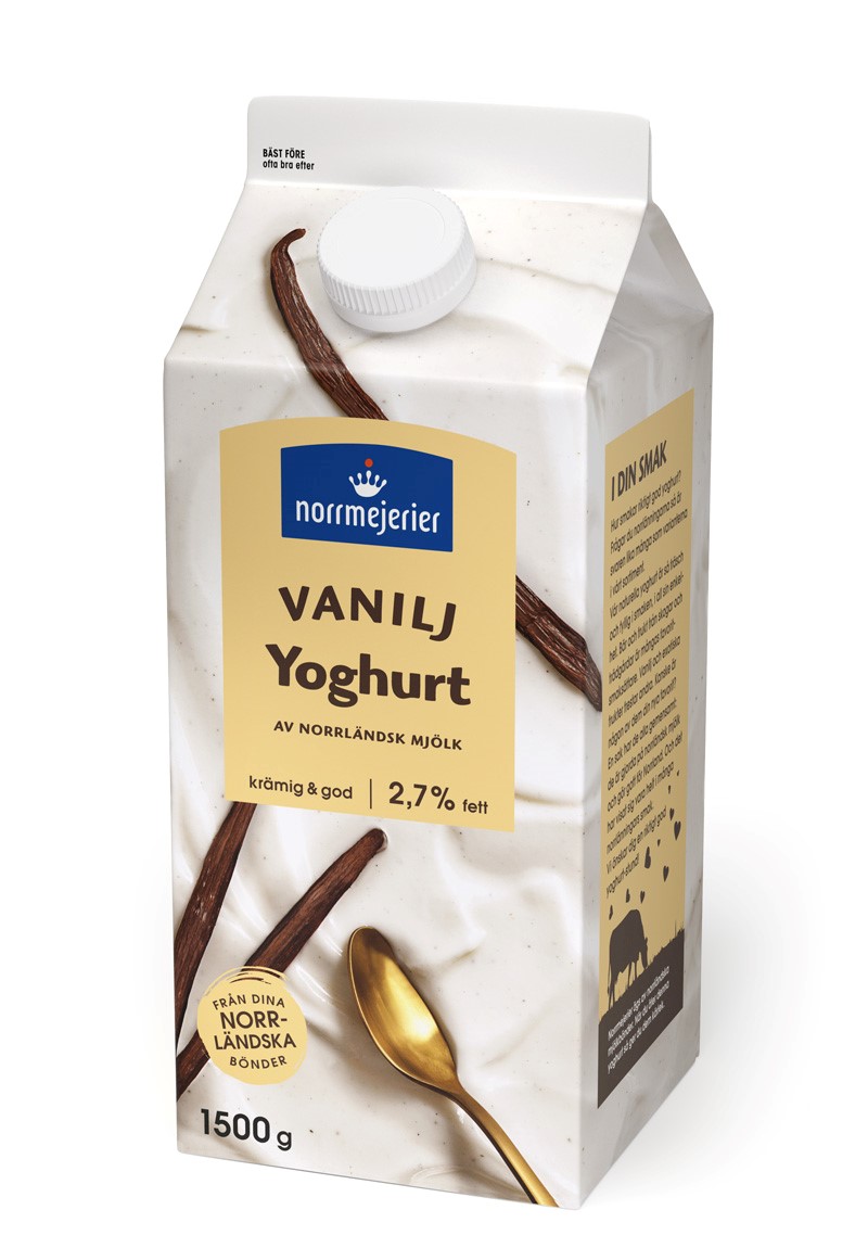 Norrmejeriers vaniljyoghurt i familjeförpackning med skruvkork har en fetthalt på 2,7%. Den är fantastiskt god och krämig och passar perfekt till frukost eller som mellanmål. Den innehåller mald vaniljstång och passar utmärkt till smoothies eller som den är med ditt favorittillbehör. Vår vaniljyoghurt är en naturlig källa till protein, och dessutom är den rik på vitamin D som vi här uppe i Norrland behöver lite extra av, speciellt under det mörka vinterhalvåret då det är extra svårt att tillgodogöra sig vitaminet. Som alla av Norrmejeriers produkter är den gjord på 100% norrländsk mjölk från norrländska bönder.