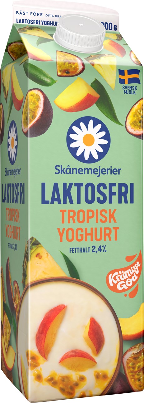 Härligt krämig laktosfri yoghurt smaksatt med tropiska frukter och bär. Servera till frukost, snabbt mellanmål som den är, eller