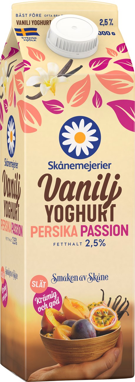 Vaniljyoghurt Persika Passion är en härligt krämig yoghurt med den milda, lena smaken av vanilj tillsammans med söt persika och syrlig passionsfrukt.
