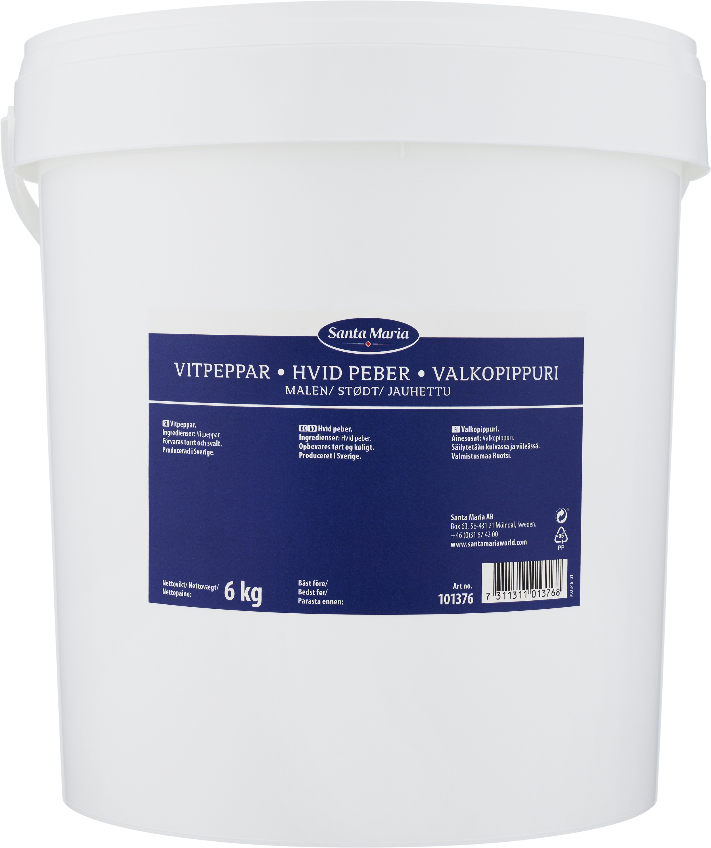 Vitpeppar av hög kvalitet, i mald form. Malen vitpeppar har en distinkt men mild pepparsmak som gör sig väl i klassiska vita såser som bechamelsås och beurre blanc. Malen vitpeppar är också lämpligt till gryta, soppa, fisk och skaldjur. Vitpeppar framställs av det mogna, skalade bäret från pepparplantan Piper Nigrum.