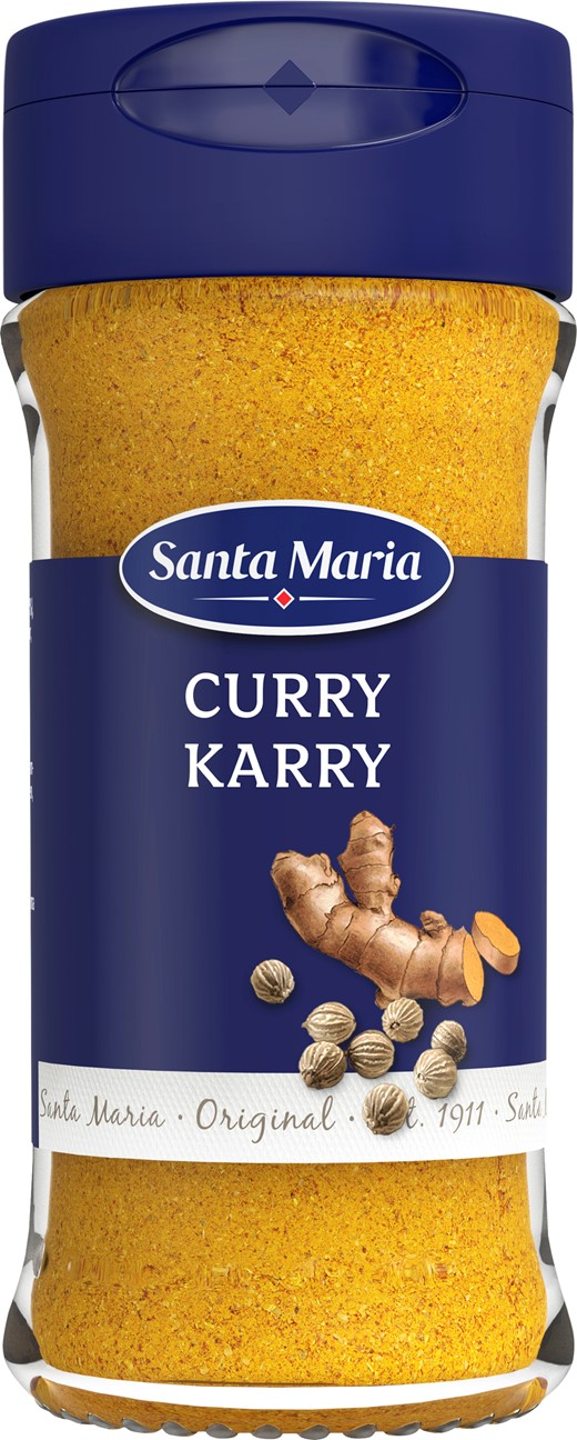 Klassisk mild currykrydda av högsta kvalitet. Curry är en älskad kryddblandning som passar utmärkt till kyckling, indisk curry, risrätter, varma och kalla såser. Curry får sin karakteristiska färg av gurkmeja. Santa Maria Curry får sin klassiska currysmak av spiskummin, koriander, bockhornsklöver, svartpeppar och fänkål. • Curry förvaras torrt och mörkt för att bevara aromen längre