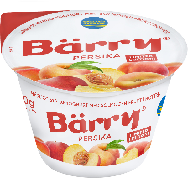 | Marknadsbudskap: | Bärry Persika är en frisk och syrlig yoghurt med solmogen frukt i botten. Den är gjord av svensk mjölk och har en fetthalt på 2,7%. Njut av din Bärry till frukost, mellanmål eller dessert - yoghurten och sylten var för sig eller varsamt omrörd. |