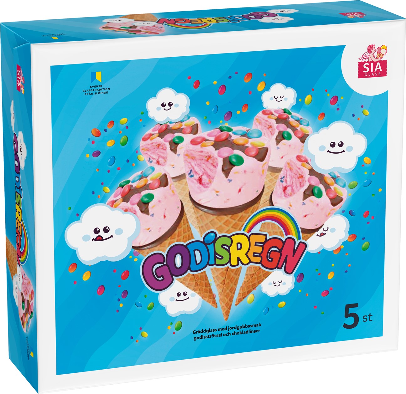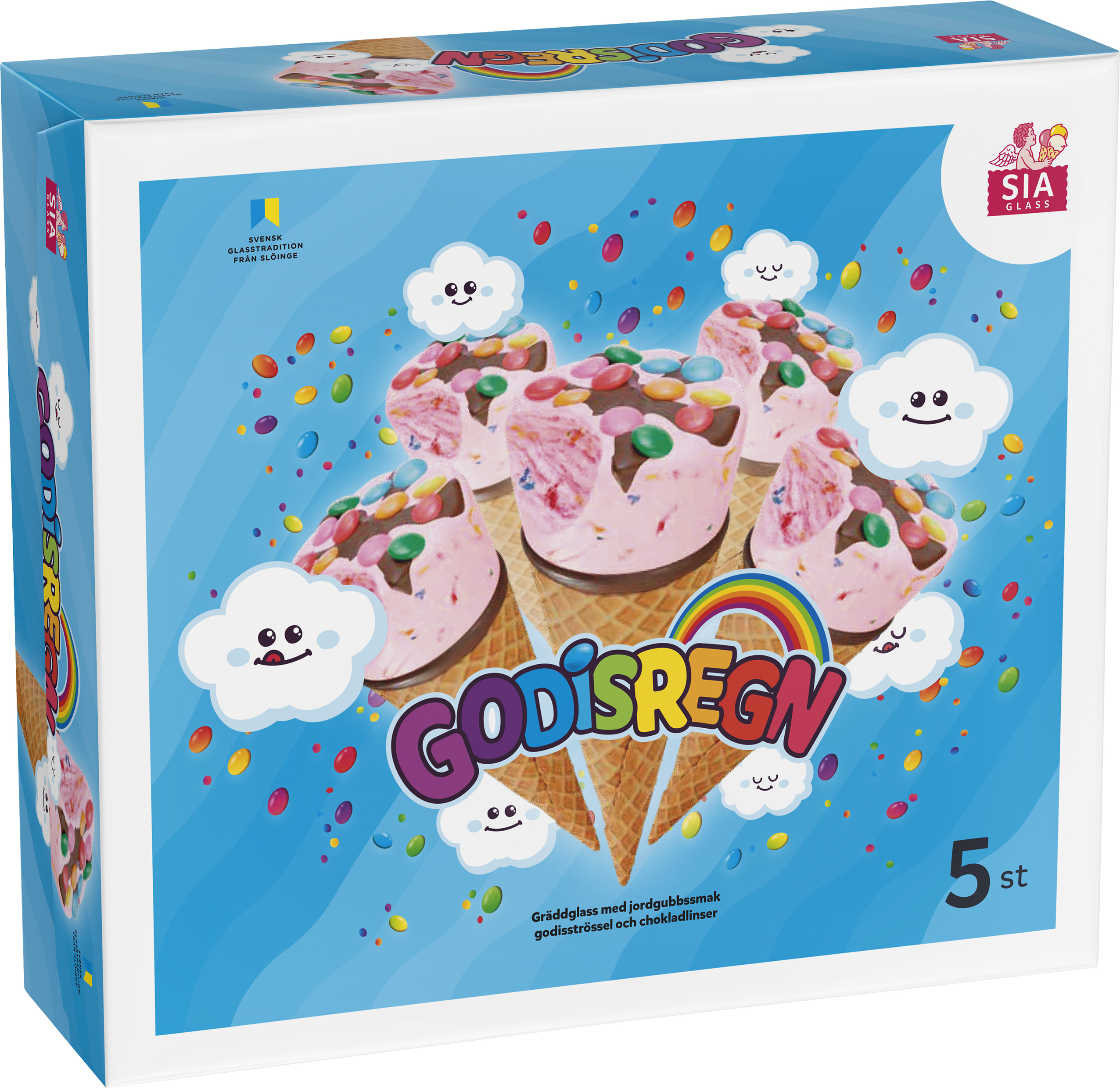 | Sökbegrepp E-handel | Godisregn, jordgubbssmak, regnbåge, strössel, chokladlinser, godis, gräddglass, glass, svensk glass, strut, bakat rån, SIA Glass siaglass, sia, barnkalas, glassfest |