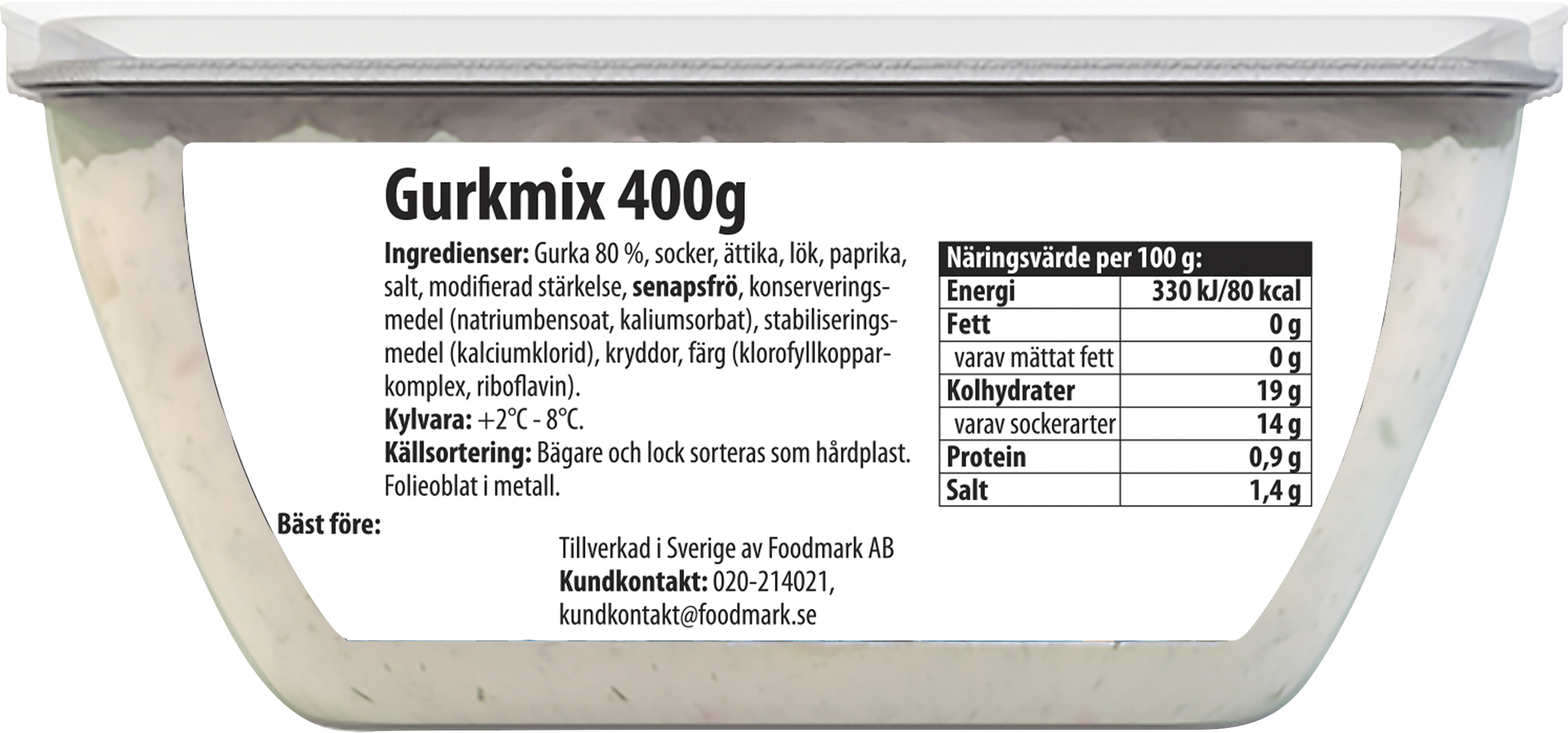 | Ingrediensförteckning: | Gurka 80 %, socker, ättika, lök, paprika, salt, modifierad stärkelse, SENAPSFRÖ, konserveringsmedel (natriumbensoat, kaliumsorbat), stabiliseringsmedel (kalciumklorid), kryddor, färg (klorofyllkopparkomplex, riboflavin). |