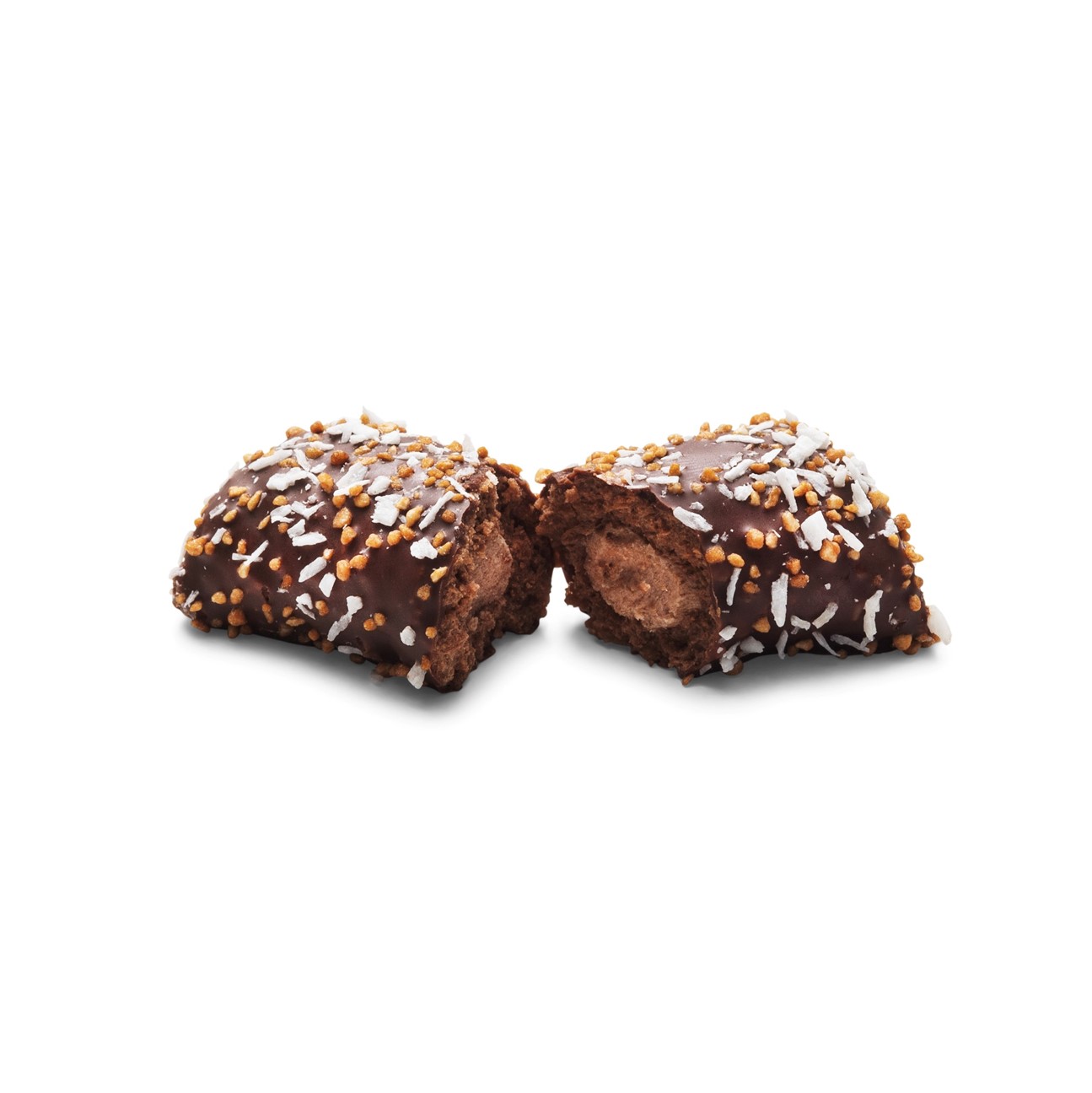 Mjuk kondisbit, kräm med smak av mocka, täckt med kakaoöverdrag, strössel och kokos. Glutenfri. Växtbaserad.