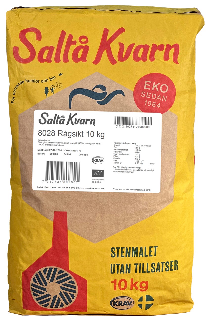 | Marknadsbudskap: | Saltå Kvarns rågsikt är en färdig mjölblandning som består av 60 % siktat vetemjöl och 40 % siktat och finmalet rågmjöl. Mjölet är malt på stenkvarn. Rågsikt passar bäst till matbröd och ger ett saftigt och gott bröd. |