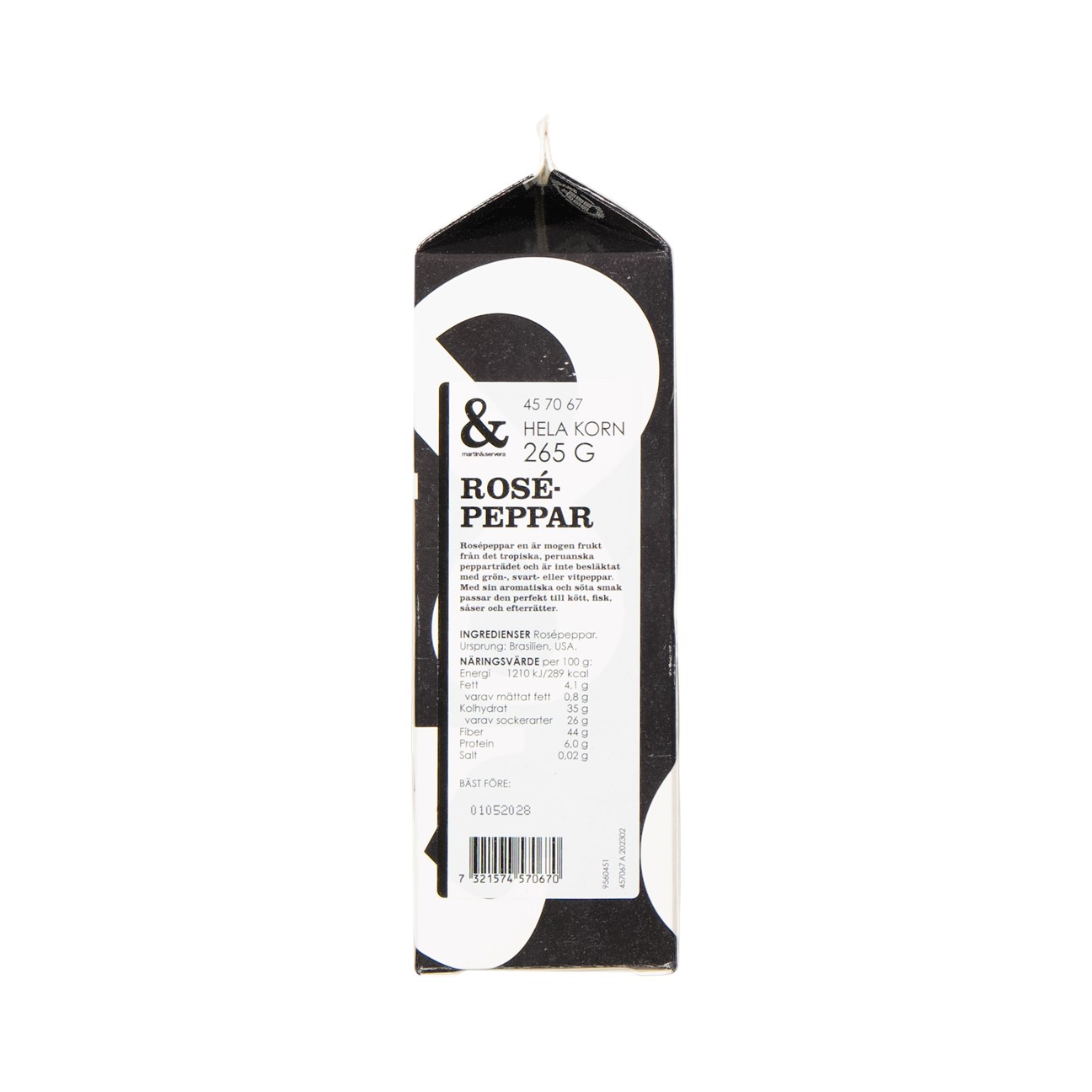 Smaksätt dina rätter med vår rosépeppar. Kryddan har aromatisk och söt karaktär som inte är lik traditionell peppar. Det gör rosépeppar till en intressant smaksättare till vilt, fisk, skaldjur, ljust kött och efterrätter. Packad i Sverige och kommer i en 265 grams förpackning.