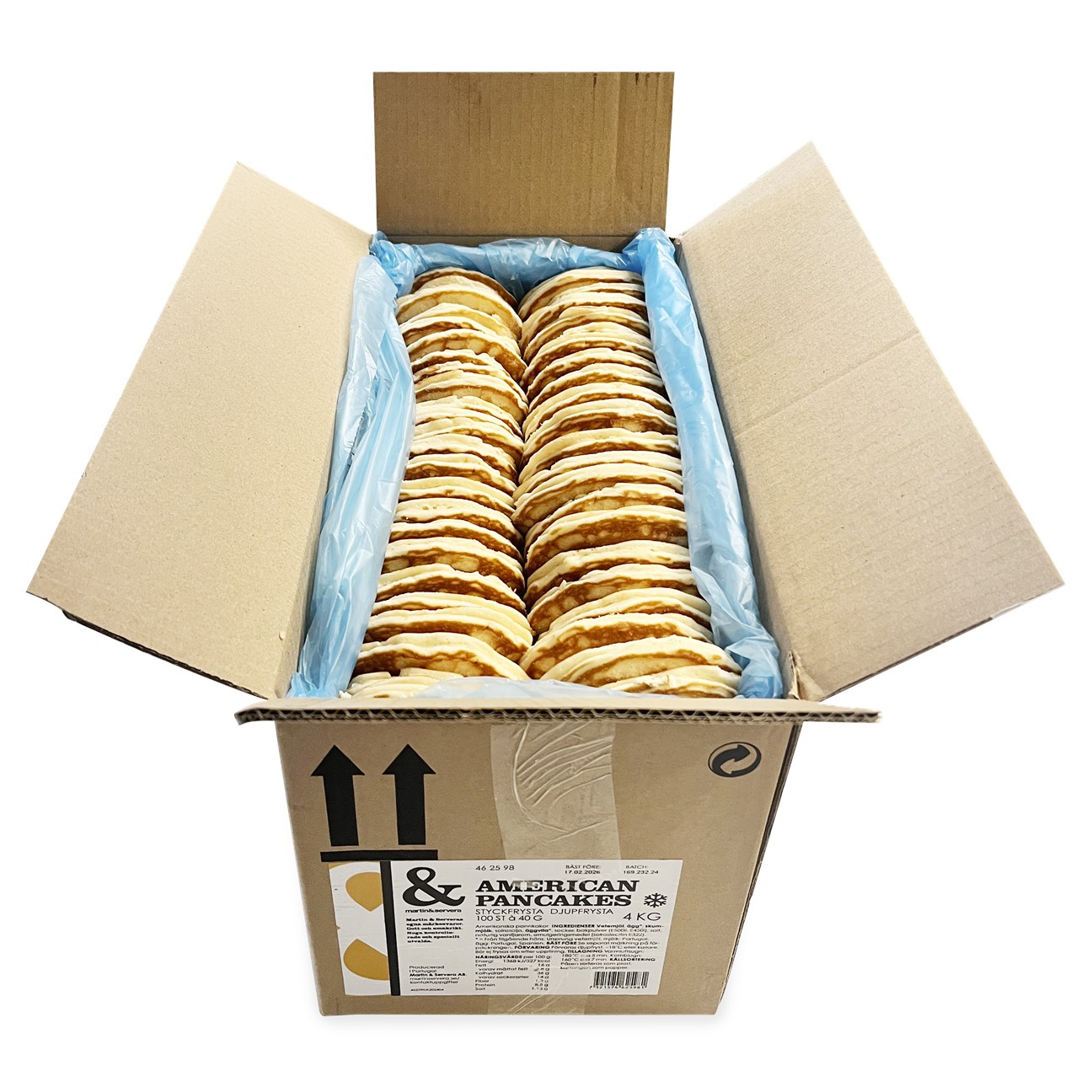 Erbjud dina gäster en smak av USA med våra färdiga amerikanska pannkakor. Med sin fluffiga konsistens och autentiska smak är de ett utmärkt val för frukostmenyn, brunchbuffén eller som söt avslutning på måltiden. Våra amerikanska pannkakor är enkla att tillaga så du får jämn och hög kvalitet varje gång. Pannkakorna väger 40 gram per styck och kommer i en kartong om 4 kilo.