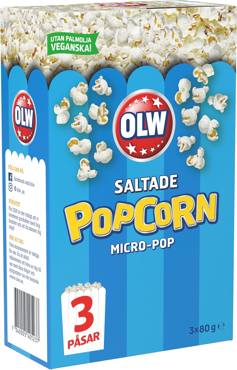 Beskrivning Artikelkategori: Micropop Salt Artikelbeskrivning: OLW Micropop Salt 3x80g Produktnamn: Micropop Salt Varumärke: OLW Förpackningsstorlek: 3x80g