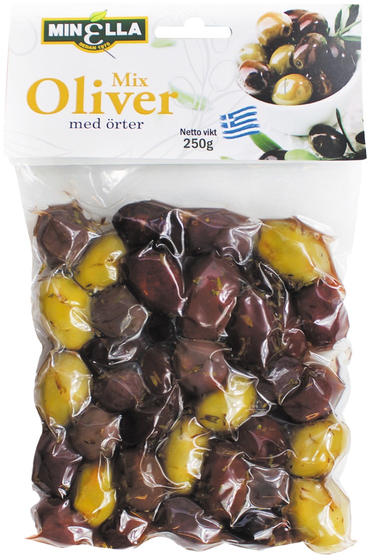Kalamataoliver (salt, surhetsreglerande medel (mjölksyra)), gröna oliver (salt, surhetsreglerande medel (mjölksyra)) i varierande proportioner 98%, örter 1%, solrosolja
