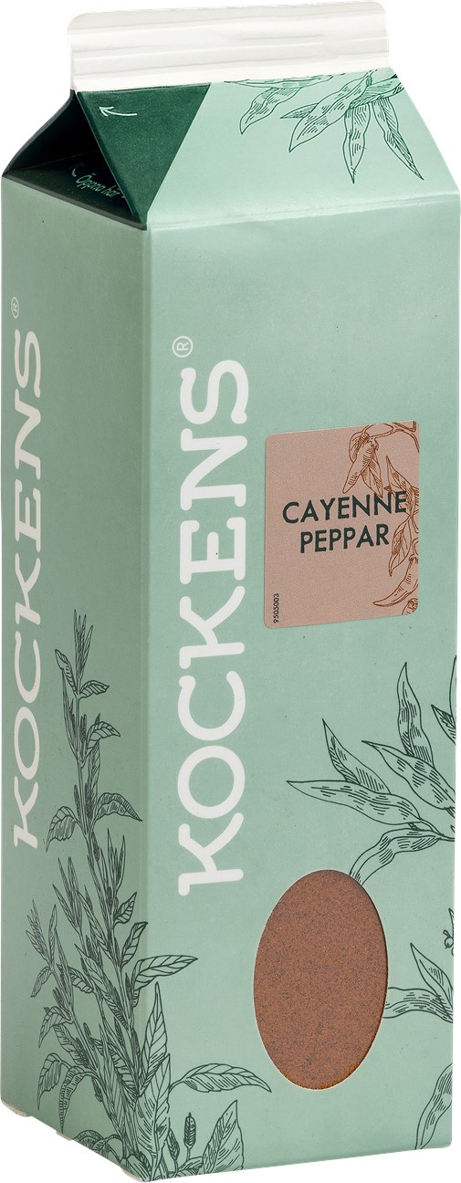 | Kort marknadsbudskap: | Cayennepepparn är packad i FSCmärkt kartong med skruvkork, plastråvara från tallolja. Kryddan är packad i Fjälkinge i Skåne. |