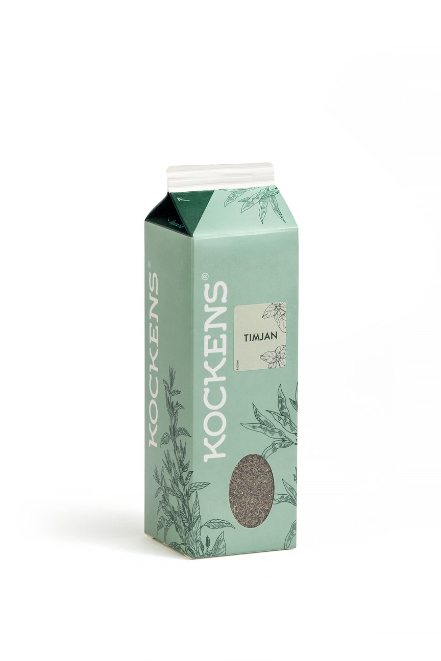 Timjan är en välkänd och viktig ört som har använts som kryddväxt i århundraden. Kryddtimjan (även kallad trädgårdstimjan) är en flerårig, 10-30 cm hög buske med vita, rosa eller violetta blommor. Bladen är små, ovala och spetsiga och kan användas både torkade, färska och frysta. Timjan passar bra till ugnsrostade rotfrukter, kyckling och lamm samt till ärt-, tomat- och fisksoppa. Kryddan packad i FSCmärkt återförslutningsbar kartong med skruvkork av förnybar plast från tallolja. Kryddan är packad i Fjälkinge i Skåne.