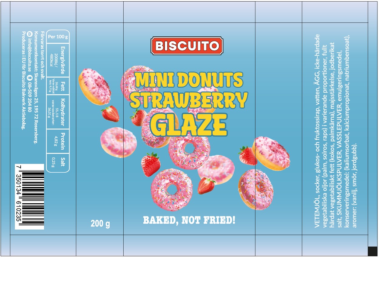 Beskrivning Artikelkategori: Mjuka Kakor Artikelbeskrivning: Mini Donuts med jordgubbsöverdrag Produktnamn: Mini Donuts - Strawberry Glaze Varumärke: Biscuito Bakverk Aktiebolag Reglerat produktnamn: Mini Donuts med jordgubbsöverdrag Förpackningsstorlek: 200