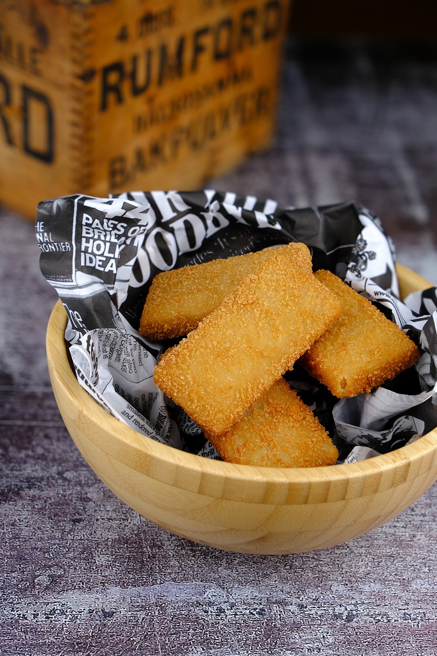 FISKFÄRS 67%, beroende på råvarutillgång varieras denna mellan SEJ (Pollachius virens) (a), TORSK (Gadus morhua) (b), KOLJA (Melanogrammus aeglefinus) (c), ALASKA POLLOCK (Theragra chalcogramma) (d)och HOKI (Macruronus novazealandiae) (e) och GULDLAX (Argentina silus) (f), VETEMJÖL, raps- och solrosolja, vatten, VETEGLUTEN, salt, druvsocker, lök, vitpeppar, syra (E330), majsstärkelse.