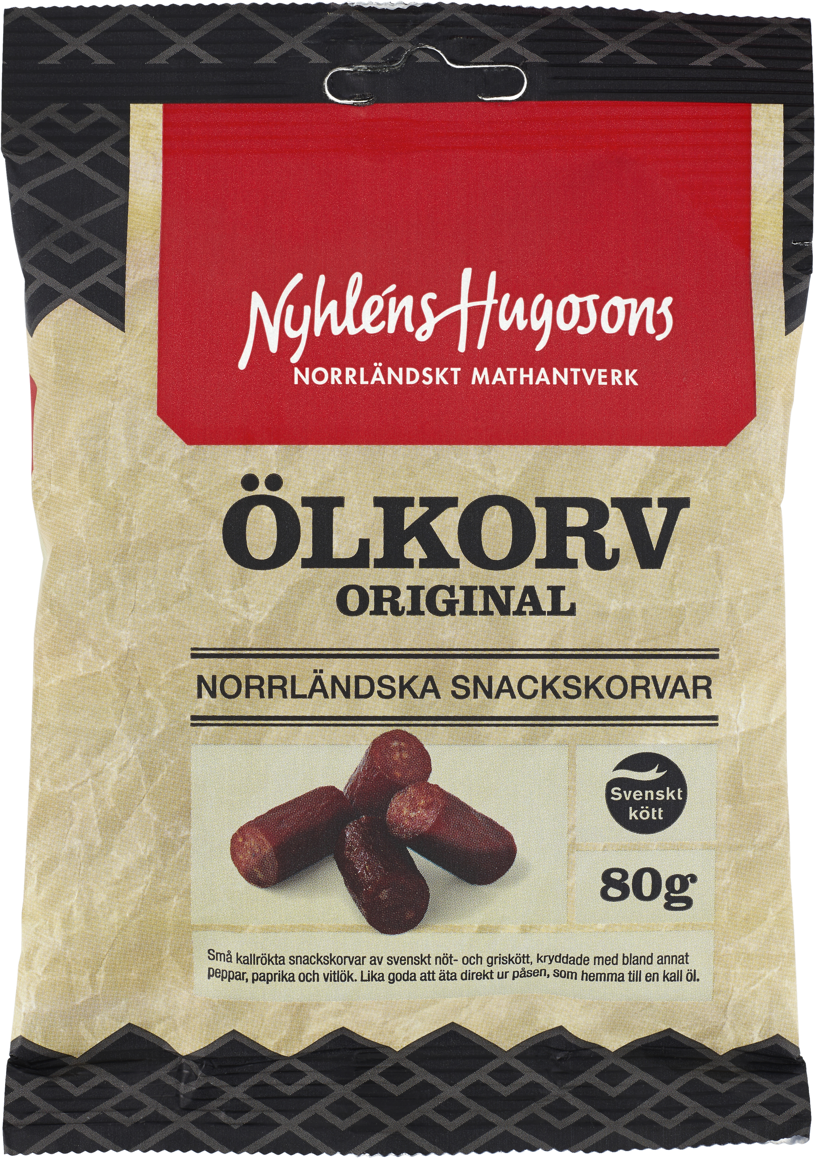 Ingredienser: Gris- & nötkött, fett från gris, salt, kryddor (peppar, paprika, vitlök, lök, koriander, humle), druvsocker (majs),