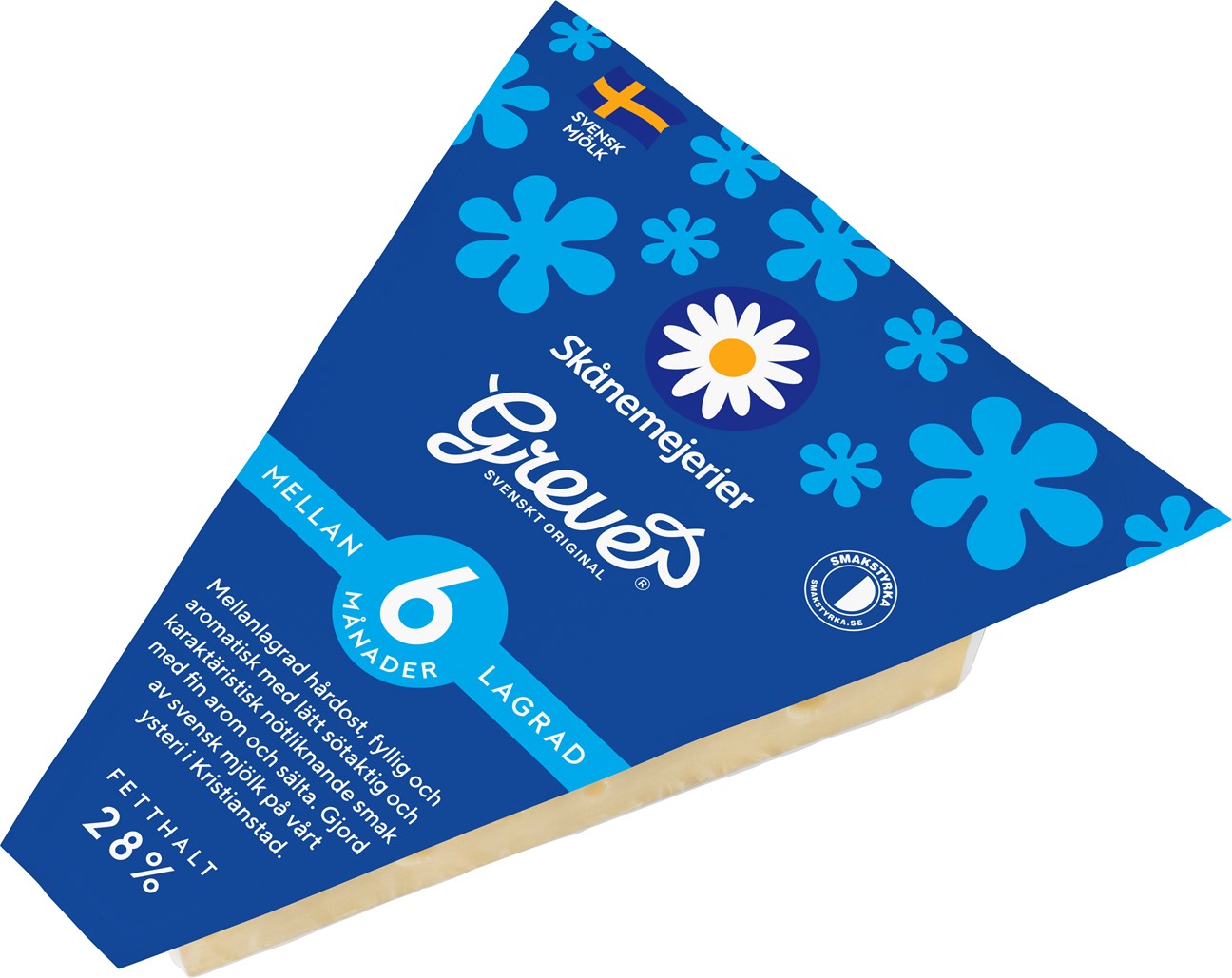Skånemejerier Grevé 28 % mellan är en fyllig och aromatisk medelstark ost med lätt sötaktig och nötig smak med smidig konsistens. Passar utmärkt som pålägg, är god som snacks såväl som i all matlagning. Gjord på mjölk från gårdar i södra Sverige med de högsta kraven på djuromsorg. Tillverkas på vårt ysteri i Kristianstad.