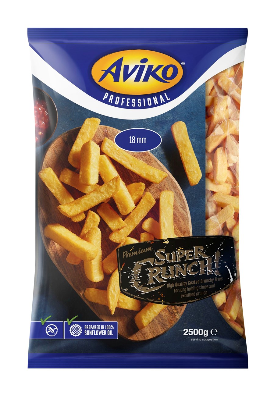 Beskrivning Artikelkategori: Pommes frites Super Crunch 18 mm Artikelbeskrivning: Premium SuperCrunch 18mm Produktnamn: Pommes frites Super Crunch 18 mm Varumärke: Aviko Förpackningsstorlek: 2,5kg
